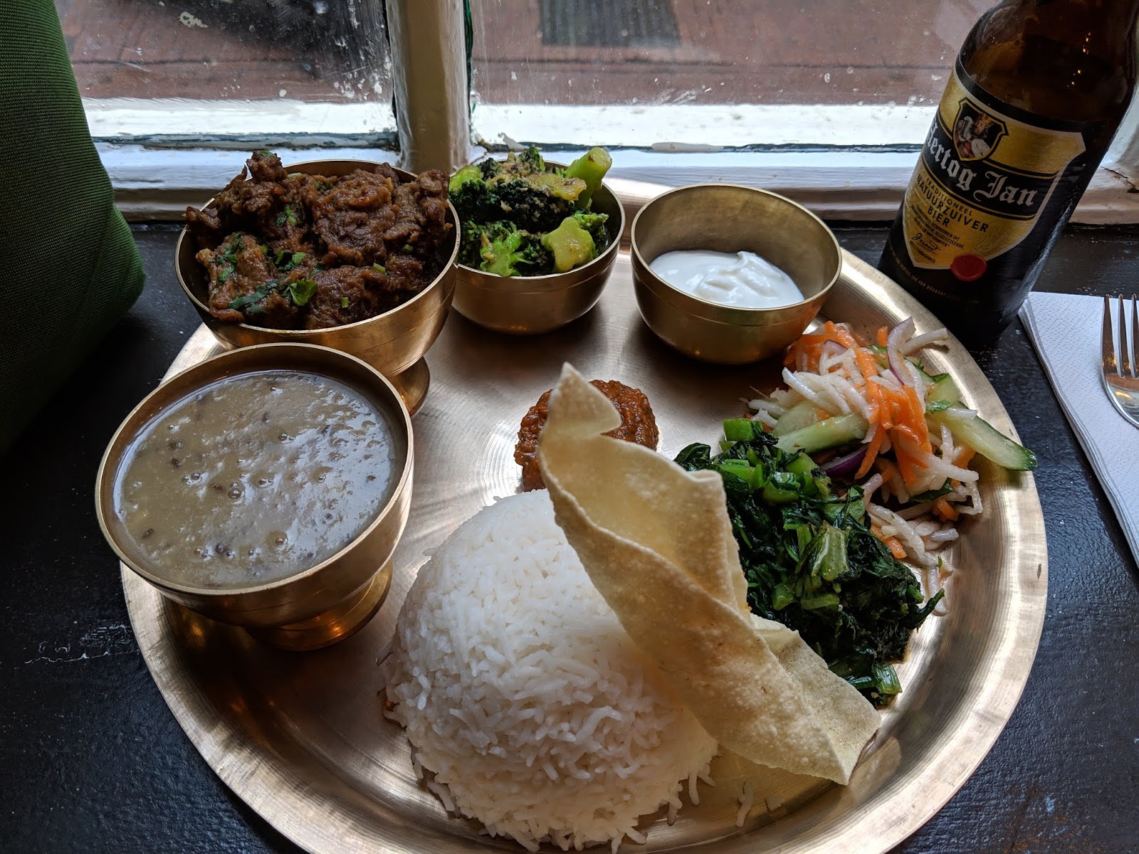 它的菜單裡有豬肉或是雞肉炒飯、炒麵、餃子甚至還有BBQ,這跟台灣快炒店在賣的東西根本沒兩樣,價格落在10-15歐區間,對我來說還算是有在合理範圍內。不過來到這邊就是要點招牌菜 BHATTI PASAL THALI (21.5 Euro.),是一道傳統的尼泊爾料理,俗話說的沒錯,好的料理是值得等待的,當菜上來時,眼睛真的為之一亮,在歐洲要吃到飯是很困難的,當時我邊吃邊差點流淚(這是真的),尤其是阿姆斯特丹市區這幾天的天氣又濕又冷。